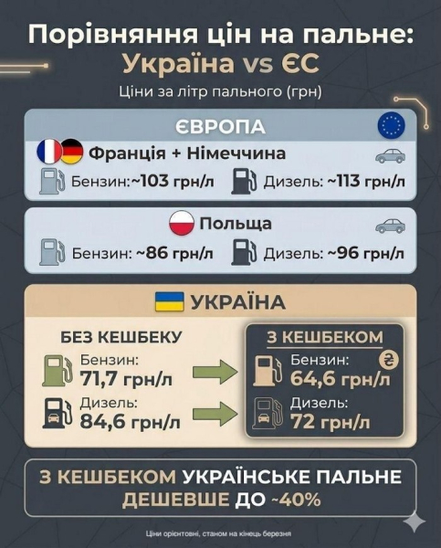 В Україні бензин — приблизно 71,7 грн літр, а з урахуванням державного кешбеку — приблизно 64,6 грн л. Дизель — 84,6 грн за літр, а з національним кешбеком 72 грн за літр, підкреслюють в Нафтогазовій асоціації України.