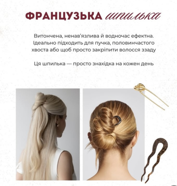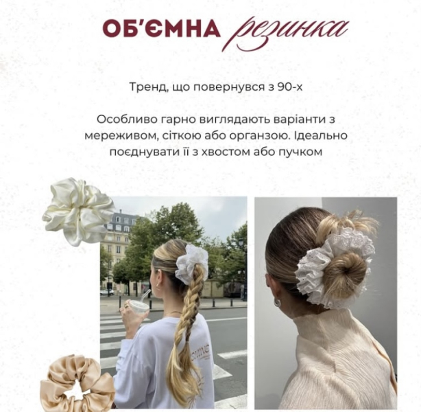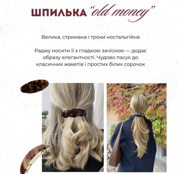 «Ідеально підходить для пучка, половинчастого хвоста або просто закріпити волосся ззаду, — написав Андре. — Обʼємна резинка — тренд, що повернувся з 90-х. Ідеально поєднувати її з хвостом або пучком. Повʼязка на голову — чорна або біла. Шпилька „old money“ — додає образу елегантності. Хустинка — можна завʼязати на голову, на сумку або навіть як топ».