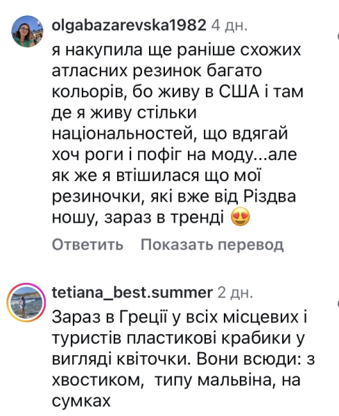 «Я накупила ще раніше схожих атласних резинок багато кольорів, бо живу в США, і там, де я живу, стільки національностей, що вдягай хоч роги і пофіг на моду… Але як же я втішилася що мої резиночки, які вже від Різдва ношу, зараз в тренді», — додали у коментарях.