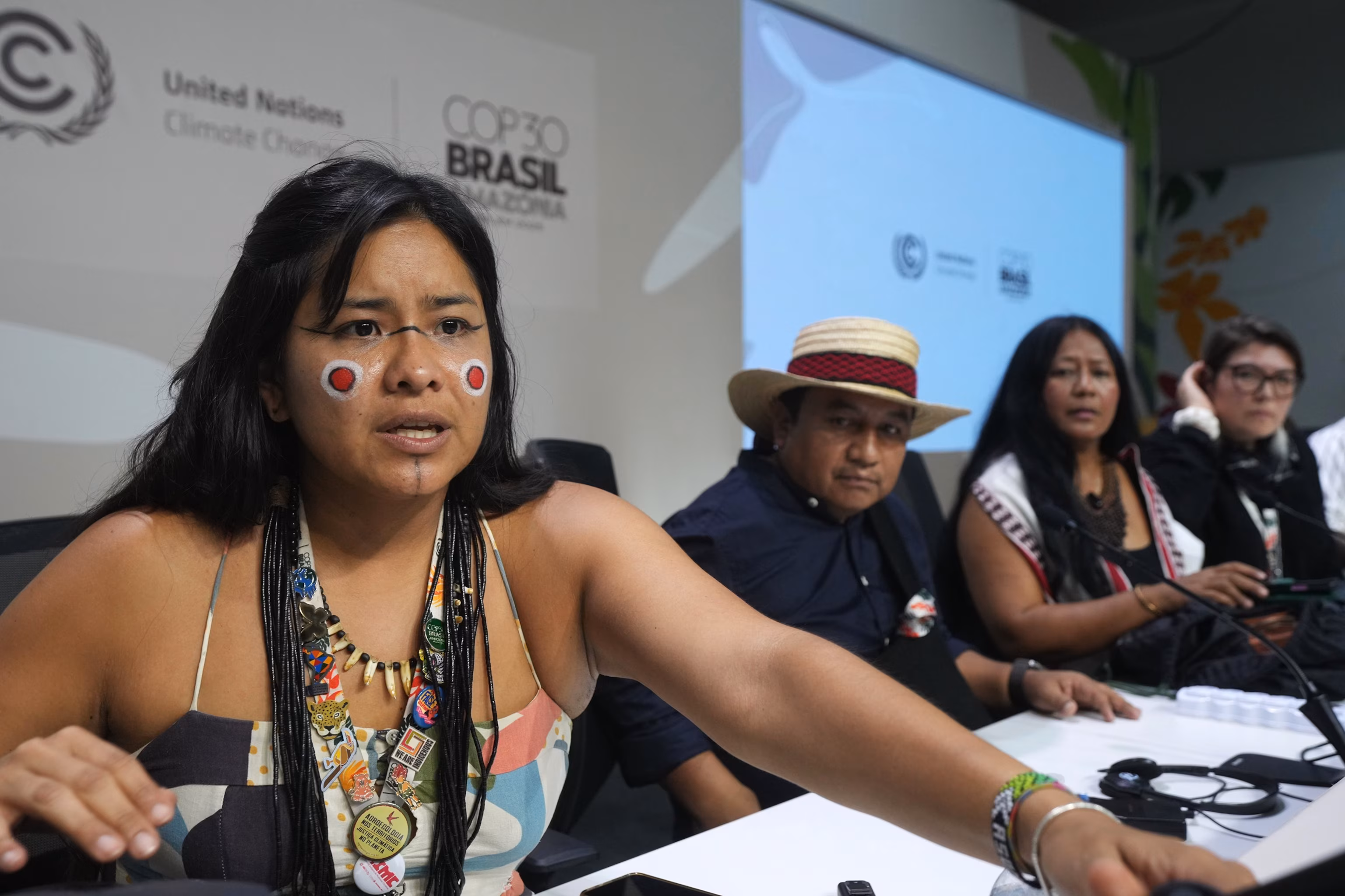 Тайлі Терена (зліва направо), Густаво Улькуе Кампо, Біна Лапрем та Сара Олсвіг відвідують форум корінних народів зі зміни клімату на Кліматичному саміті ООН COP30, 21 листопада 2025 року, в Белені, Бразилія. Андре Пеннер/AP