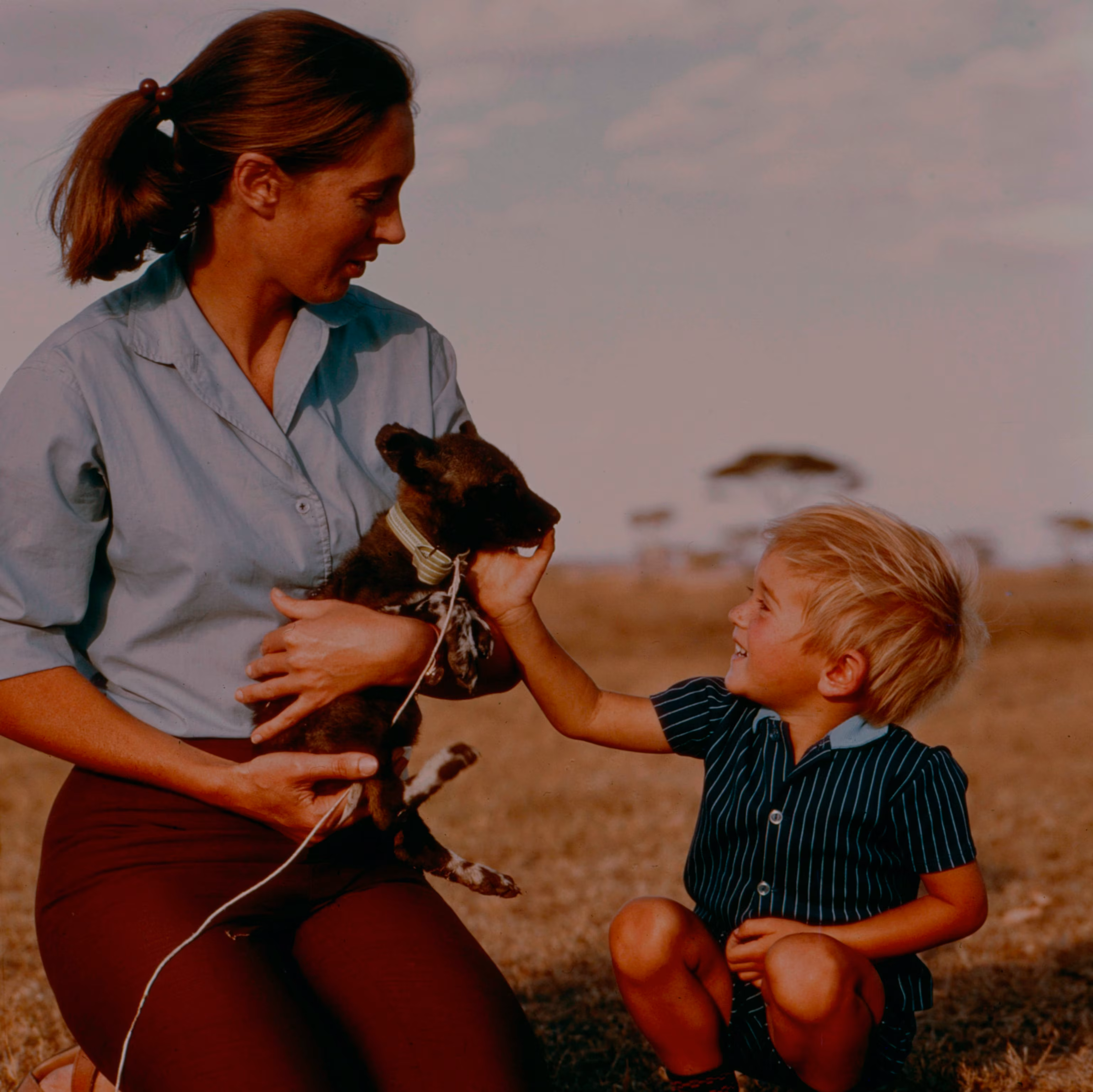 (Зліва направо) Джейн Гудолл та її син Гуго Ерік Луї ван Лавік знімаються у спеціальному випуску ABC TV «Джейн Гудолл та світ поведінки тварин: Леви Серенгеті» в Африці, 1976 рік. Фотоархів телеканалу Walt Disney/ABC via Getty Images