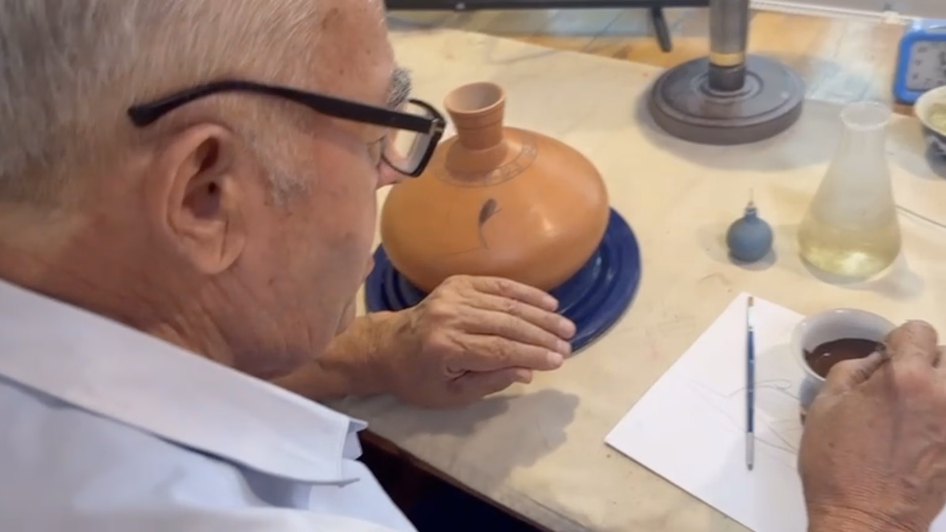 Він нахиляється вперед, тримаючи пензель у руці, і малює чорні лінії на глиняній мисці. Штрихи рівномірні, тонкі, майже як нитки. Навколо нього стоять полиці з горщиками та вазами. У дворі листя рослин обрамлене різьбленими дерев'яними колонами. Його 5-річний правнук стоїть поруч, вже в маленькому фартуху, вже торкаючись глини.
