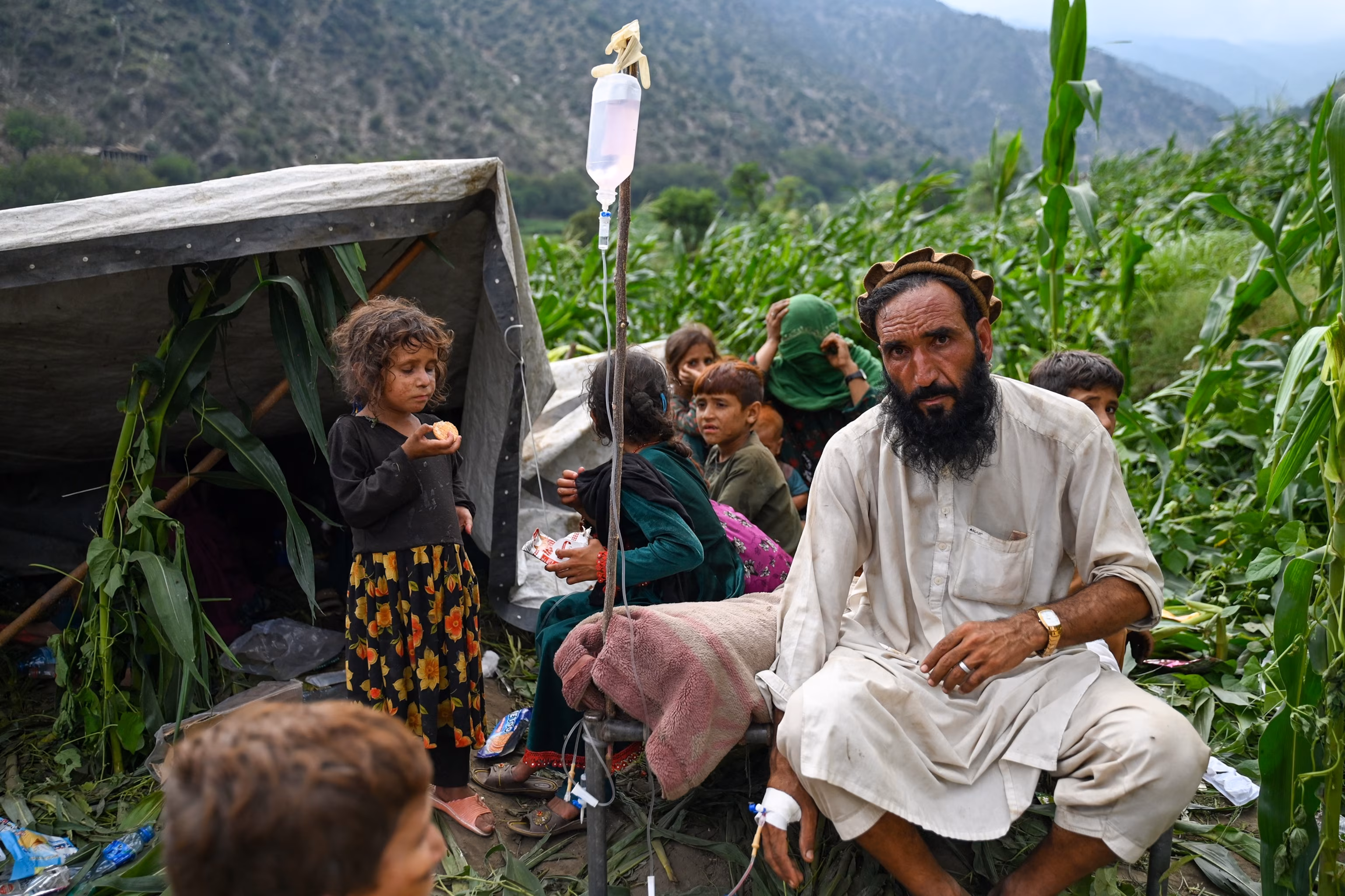 Поранений афганець отримує внутрішньовенні крапельниці на кукурудзяному полі після землетрусу в селі Мазар-Дара в районі Нургал, провінція Кунар, на сході Афганістану, 1 вересня 2025 року. Вакіл Кохсар/AFP via Getty Images