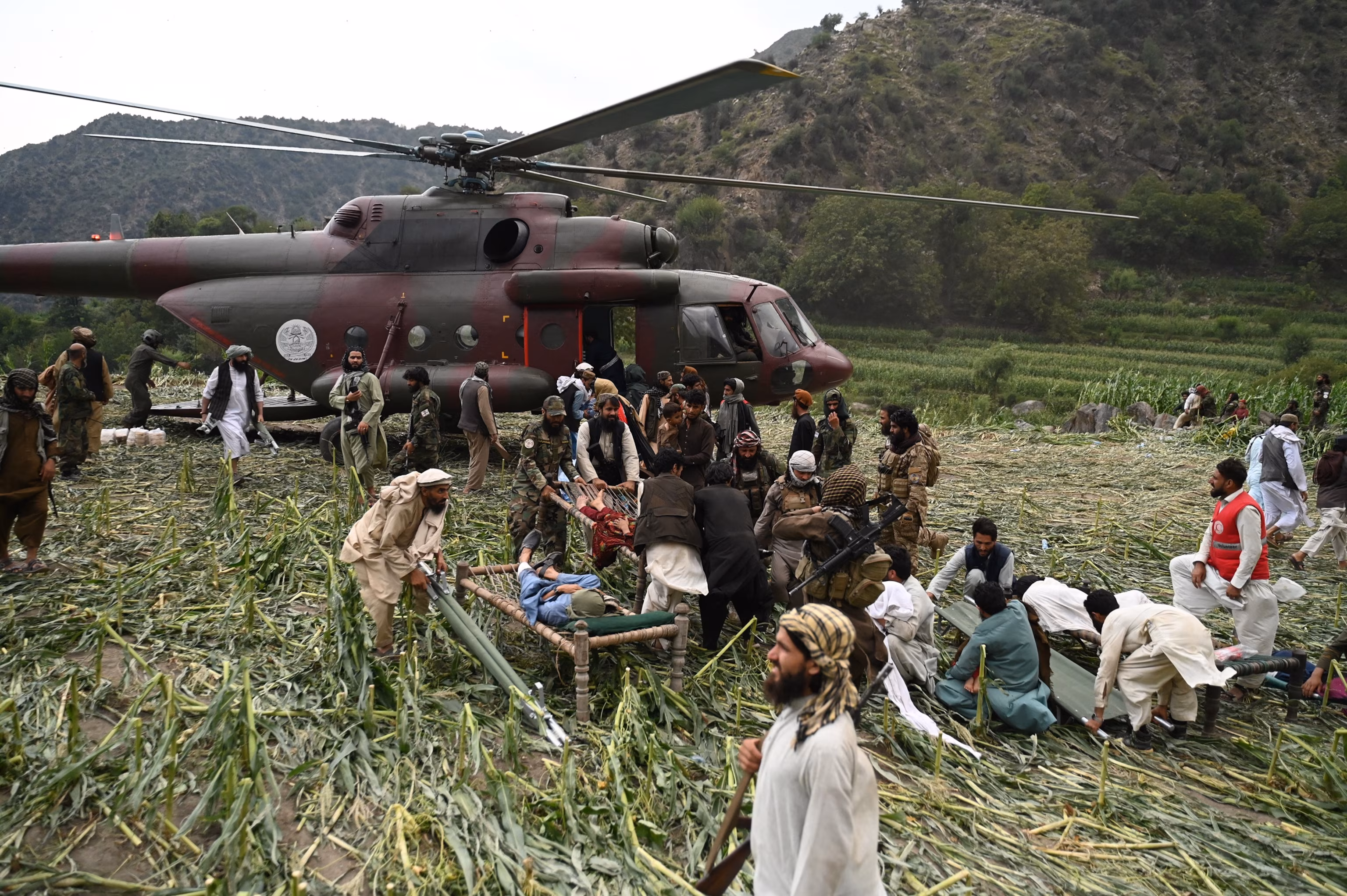 Афганські добровольці та співробітники служби безпеки Талібану працюють над переміщенням поранених людей біля військового гелікоптера після землетрусів у селі Мазар-Дара в районі Нургал, провінція Кунар, на сході Афганістану, 1 вересня 2025 року. Вакіл Кохсар/AFP via Getty Images