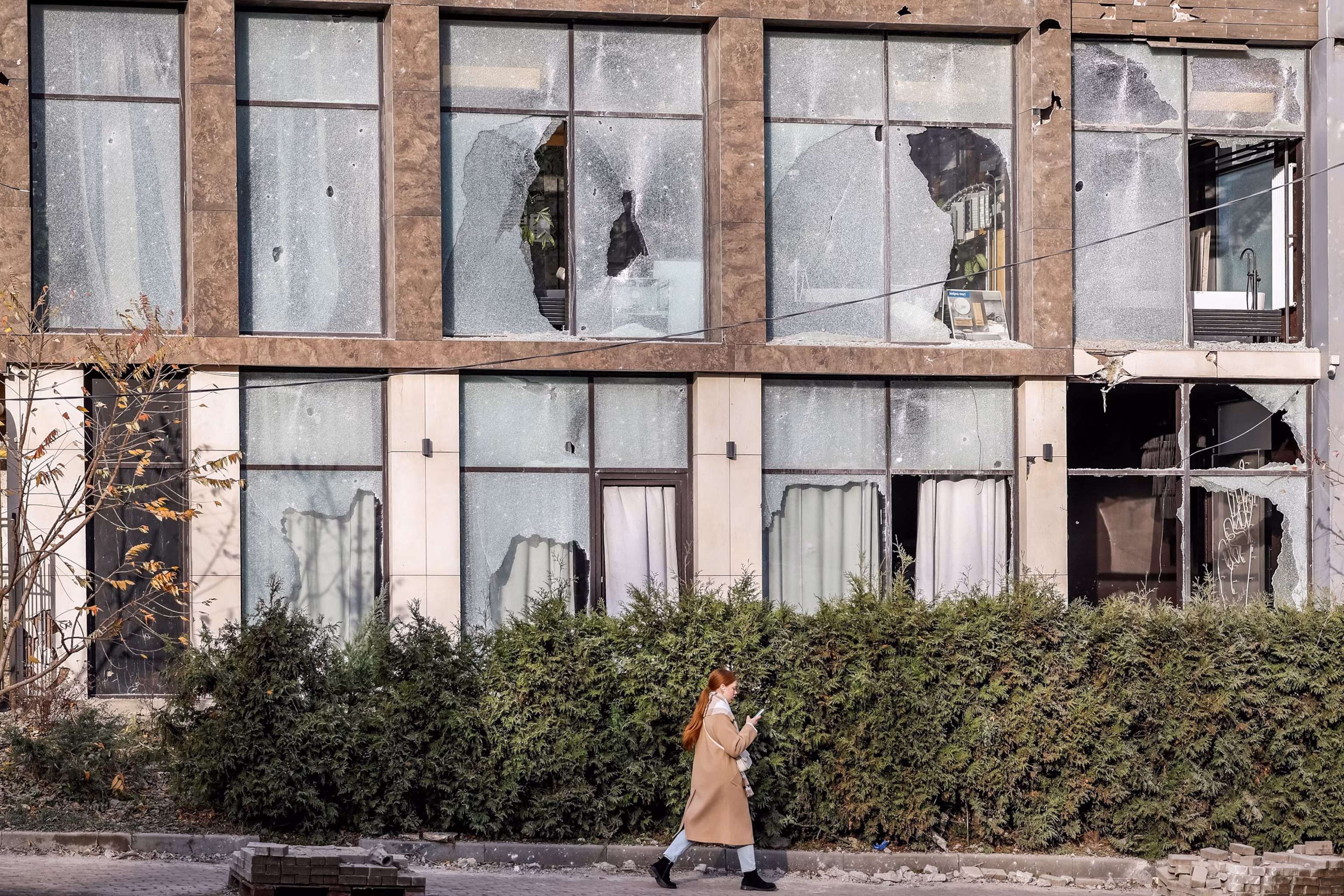 Жінка проходить повз житловий будинок, пошкоджений під час нічного удару російського безпілотника та ракетного удару на тлі нападу Росії на Україну, у Києві, Україна, 14 листопада 2025 року. Аліна Смутко/Reuters