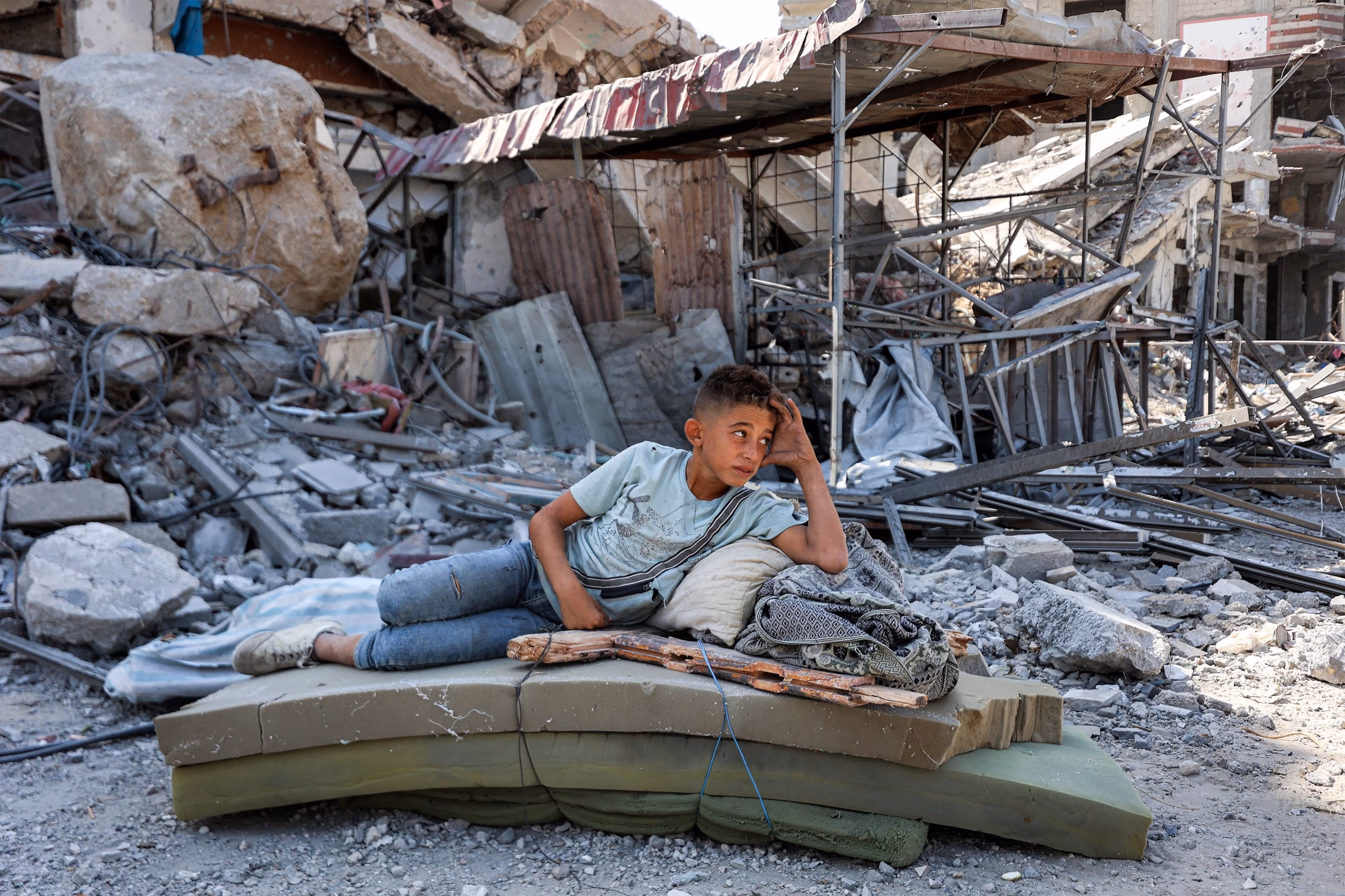 Хлопчик лежить на кількох поролонових матрацах біля завалів біля зруйнованої будівлі в центрі Хан-Юніса на півдні сектора Газа, 10 жовтня 2025 року. Омар Аль-Каттаа/AFP via Getty Images
