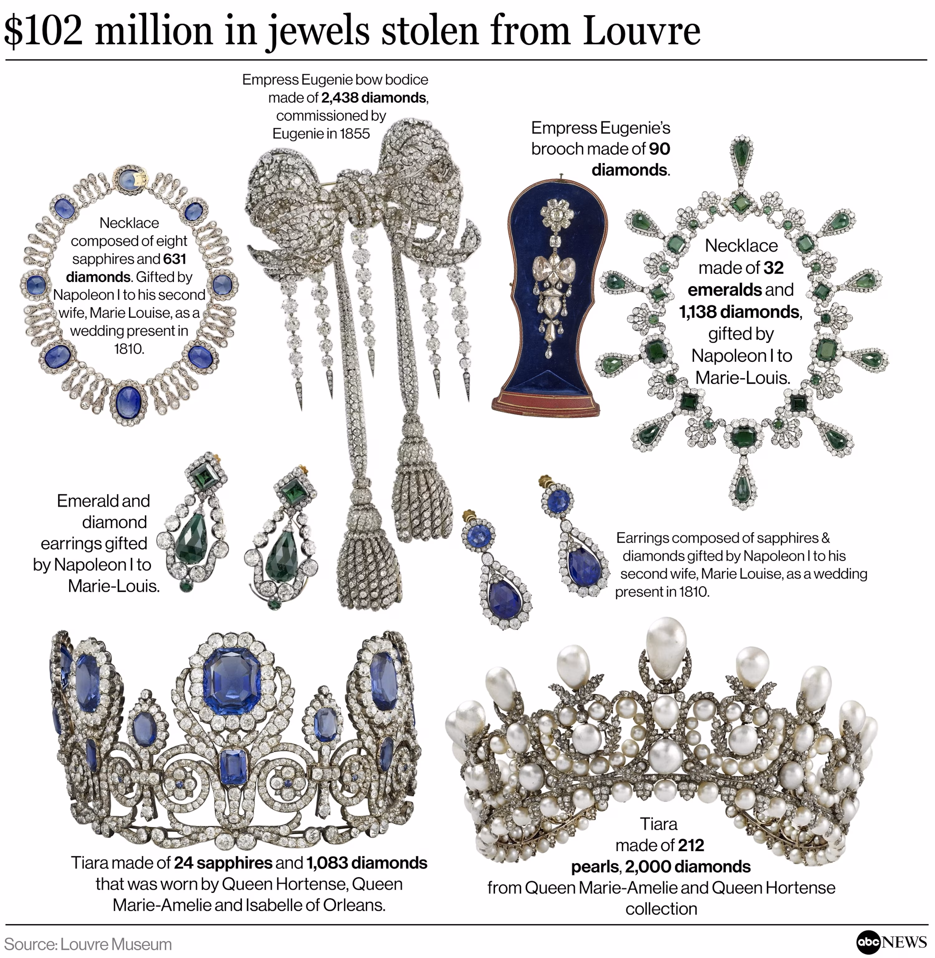 7:28 Деякі з коштовностей, викрадених під час зухвалого пограбування в музеї Лувр у Парижі 19 жовтня 2025 року, представлені на цьому недатованому фото. ABC News