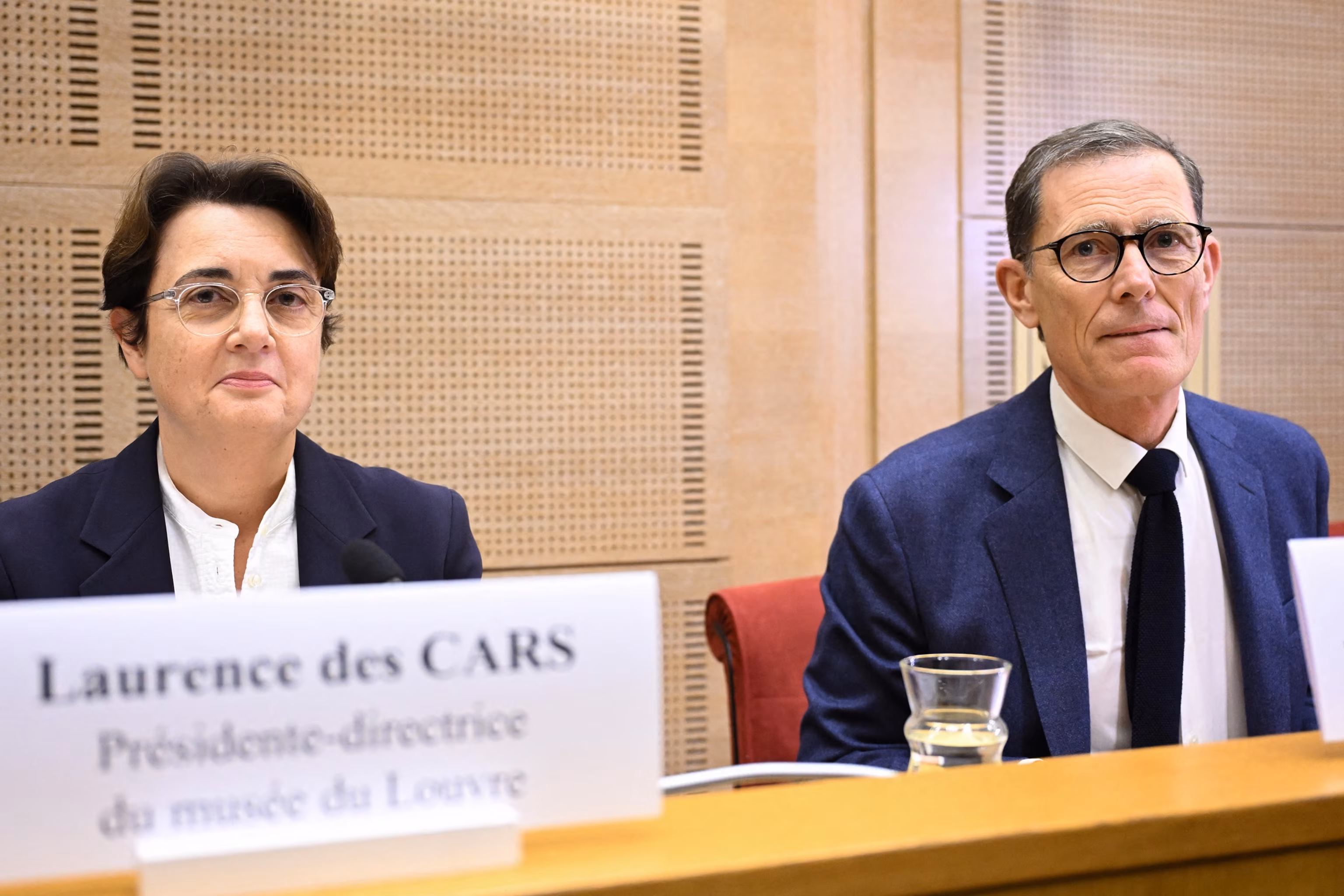 Лоранс де Кар, президент і директор музею Лувр, та французький сенатор Лоран Лафон відвідують слухання Комісії з питань культури, освіти, комунікацій та спорту у Сенаті Франції, Париж, Франція, 22 жовтня 2025 року. Бертран Гей/AFP via Getty Images