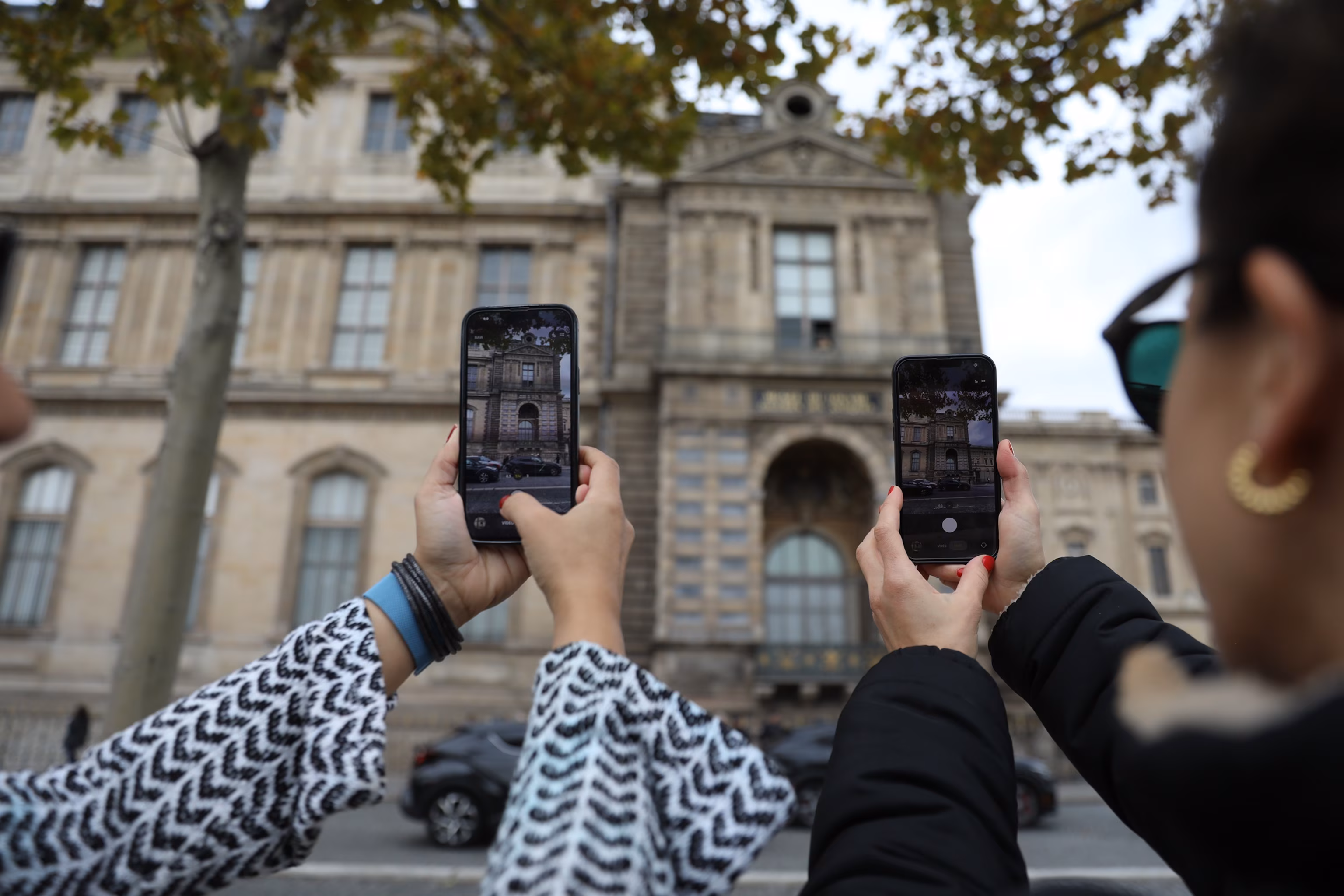 Туристи фотографуються біля галери Аполлона в музеї Лувр у Парижі, куди злодії проникли 19 жовтня 2025 року та вкрали коштовності на 102 мільйони доларів. Anadolu via Getty Images