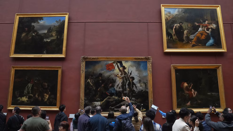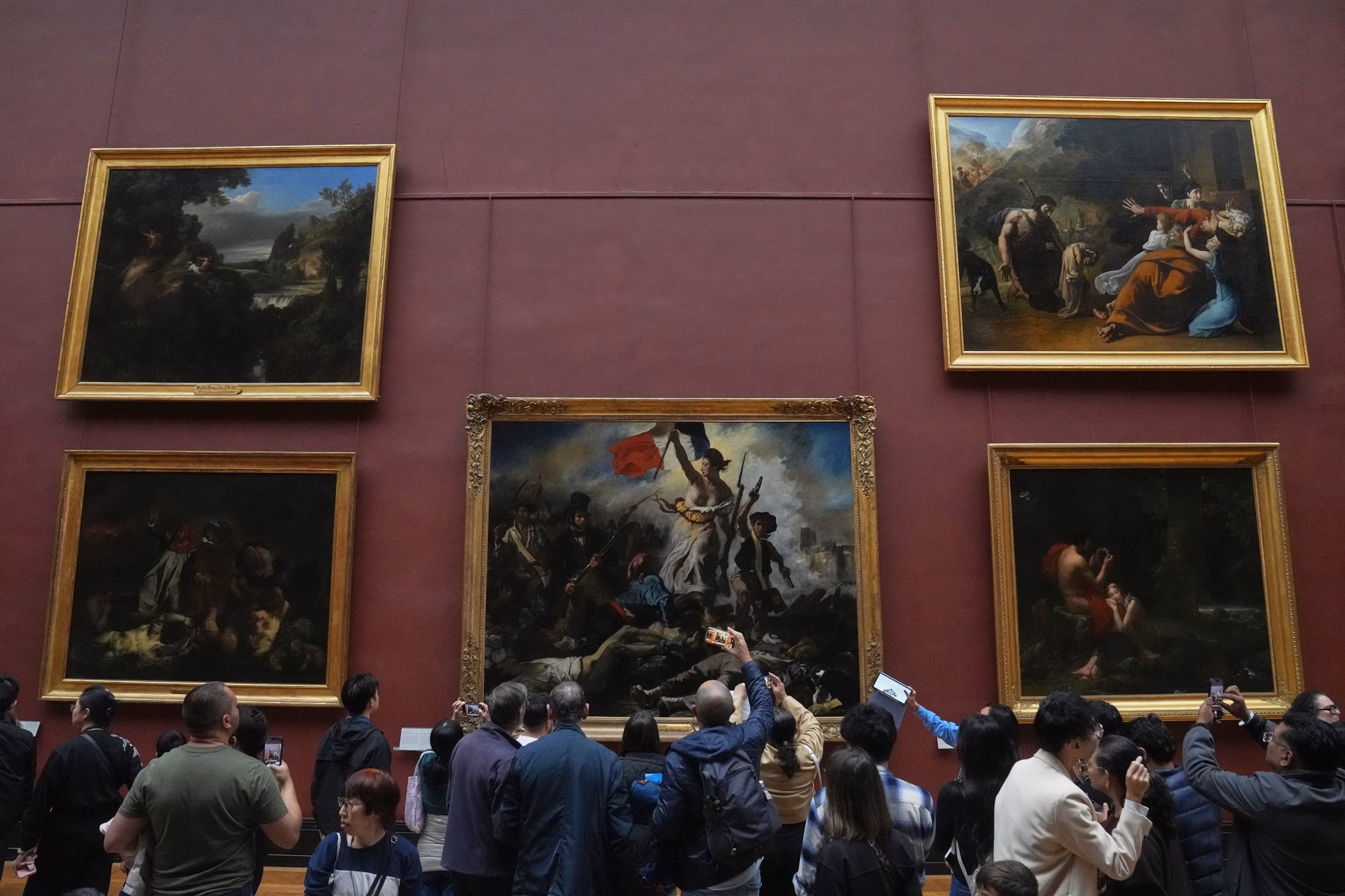 Відвідувачі дивляться картину Ежена Делакруа (у центрі) «Свобода веде народ» у музеї Лувр через три дні після того, як історичні коштовності були викрадені під час зухвалого пограбування серед білого дня, середа, 22 жовтня 2025 року в Парижі. Тібо Камю/AP