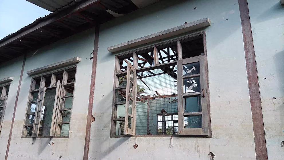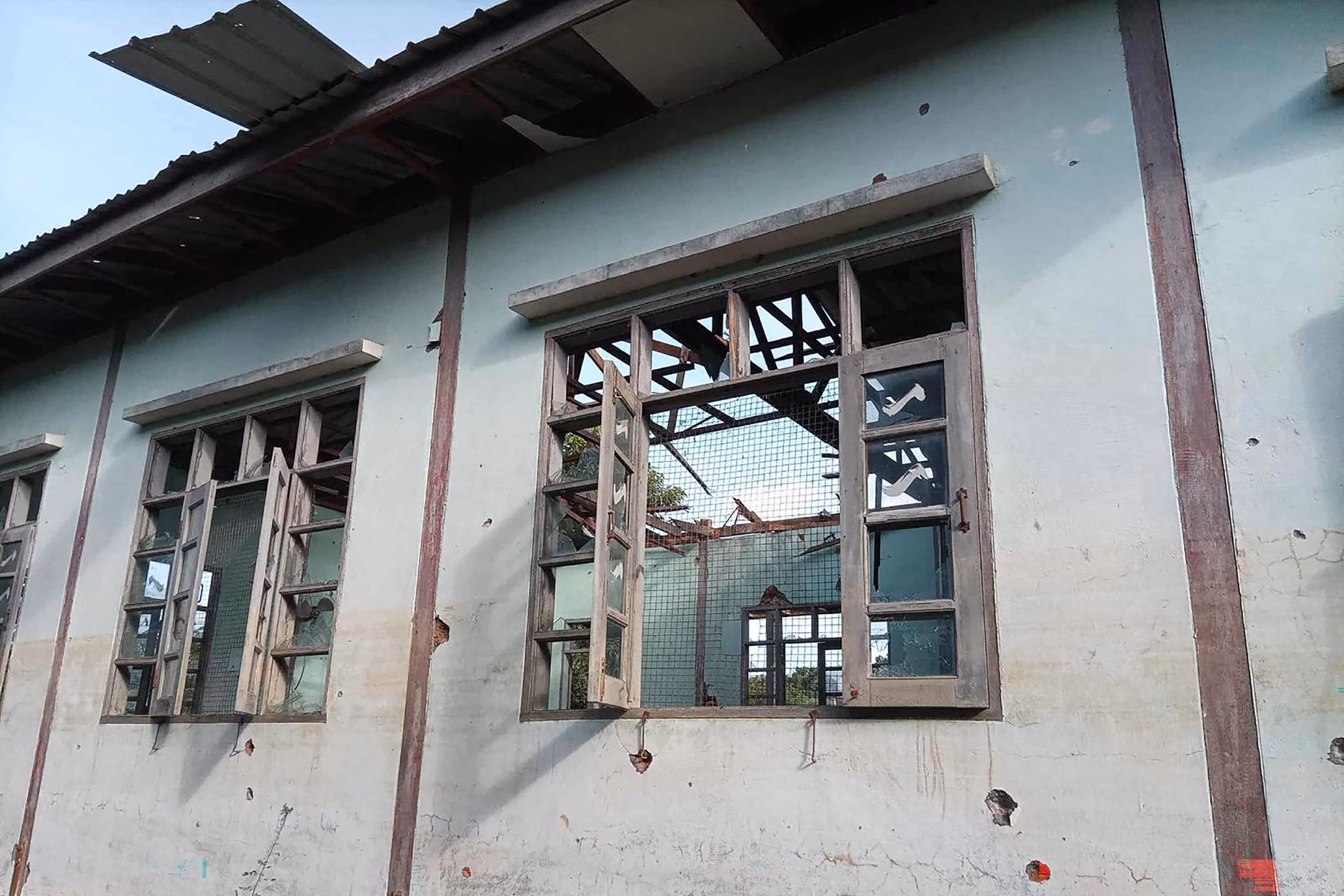 4:14 Це UGC-фотографія, надана користувачем Facebook Yebaw Hlyat Cee 7 жовтня 2025 року та отримана 8 жовтня, показує пошкодження будівлі поруч із місцем військового удару по протесту в центральній частині містечка Чаунг У М'янми. Yebaw Hlyat Cee/Facebook via AFP via Getty Images