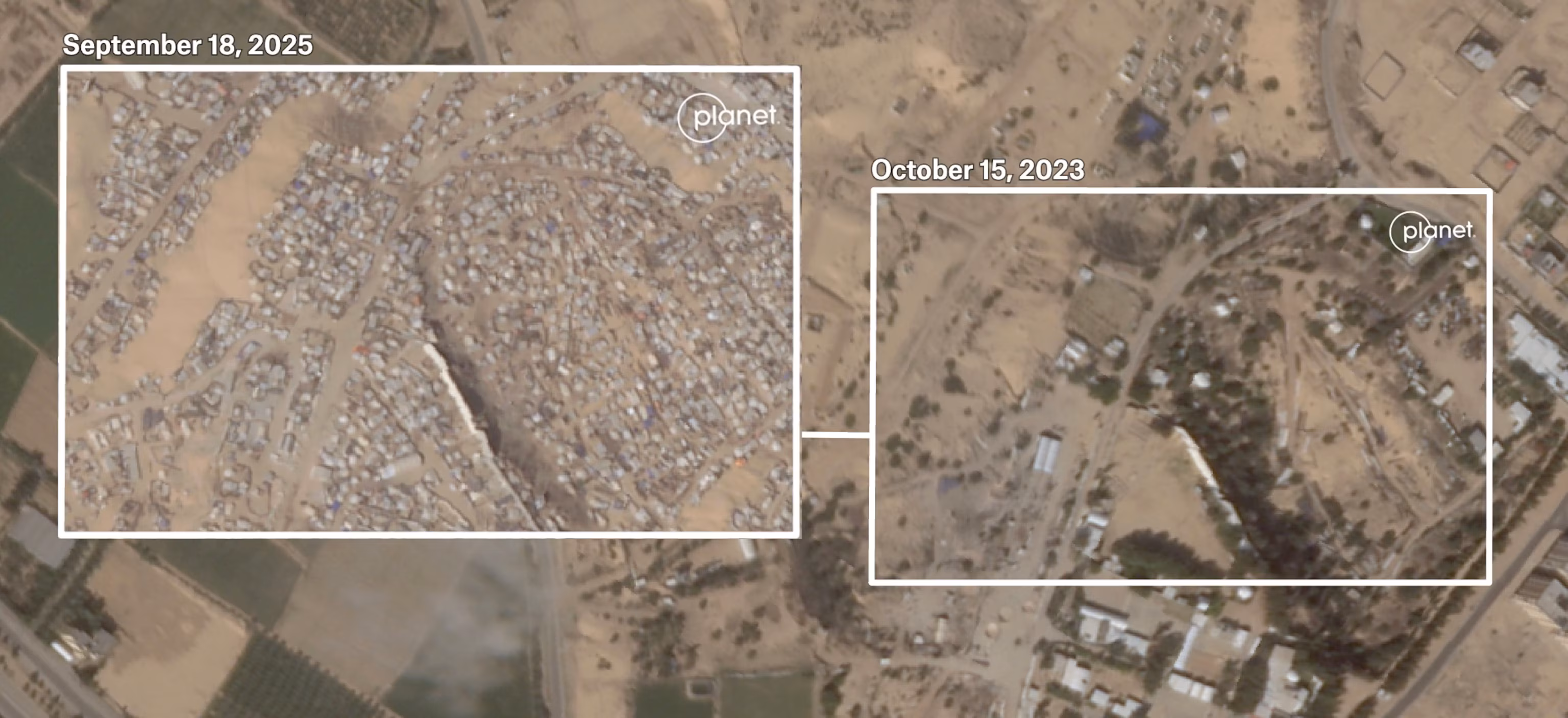 Супутникові знімки показують тисячі наметів, що замінюють поля в районі Аль-Мавасі в Газі, який Ізраїль визначив як «гуманітарну зону». Planet Labs PBC/Felt Maps