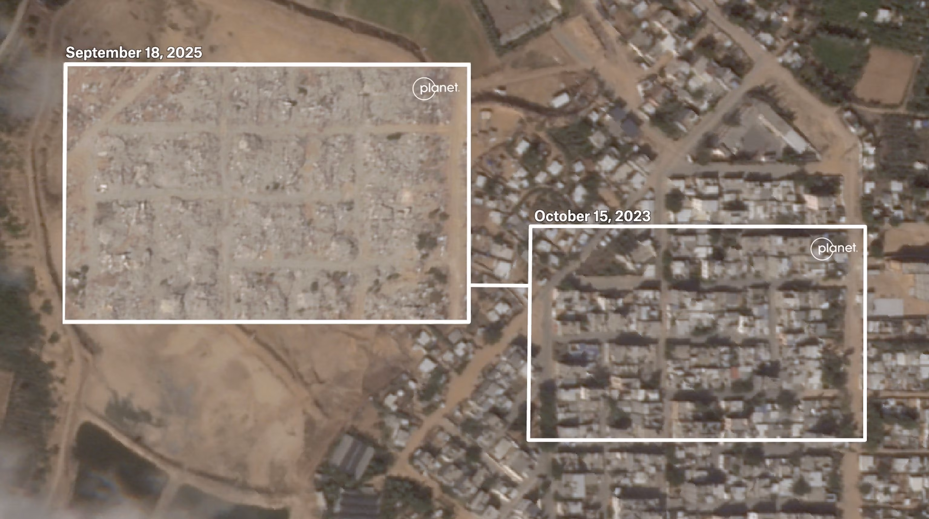 Два міста в Газі повністю зрівняні з землею. Супутникові знімки показують, що в Умм-ан-Насері та Аль-Муграці не залишилося жодної будівлі. Знімки показують, що всі споруди в цих містах зруйновані.