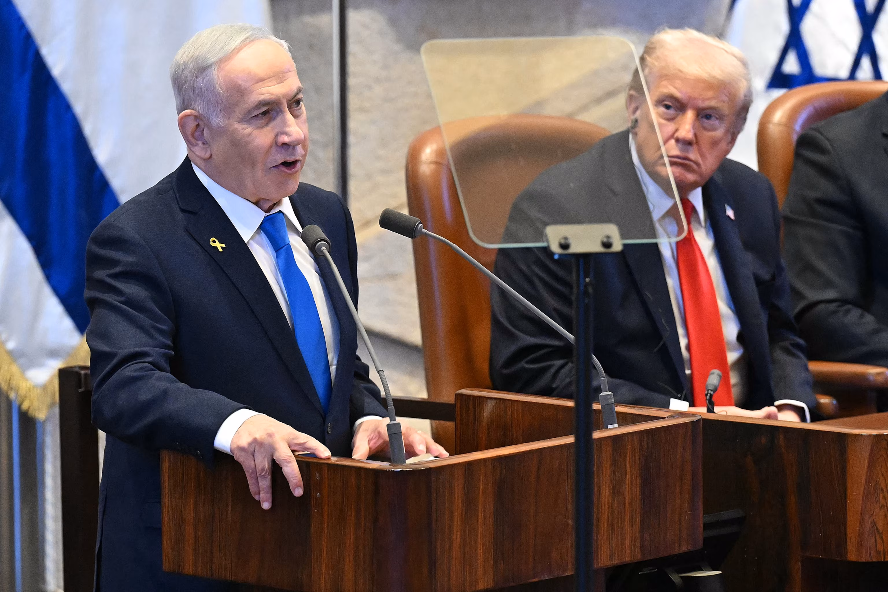 Президент Дональд Трамп слухає виступ прем'єр-міністра Ізраїлю Біньяміна Нетаньягу перед ізраїльським парламентом, Кнесетом, у Єрусалимі, 13 жовтня 2025 року. Сол Леб/Pool/AFP via Getty Images