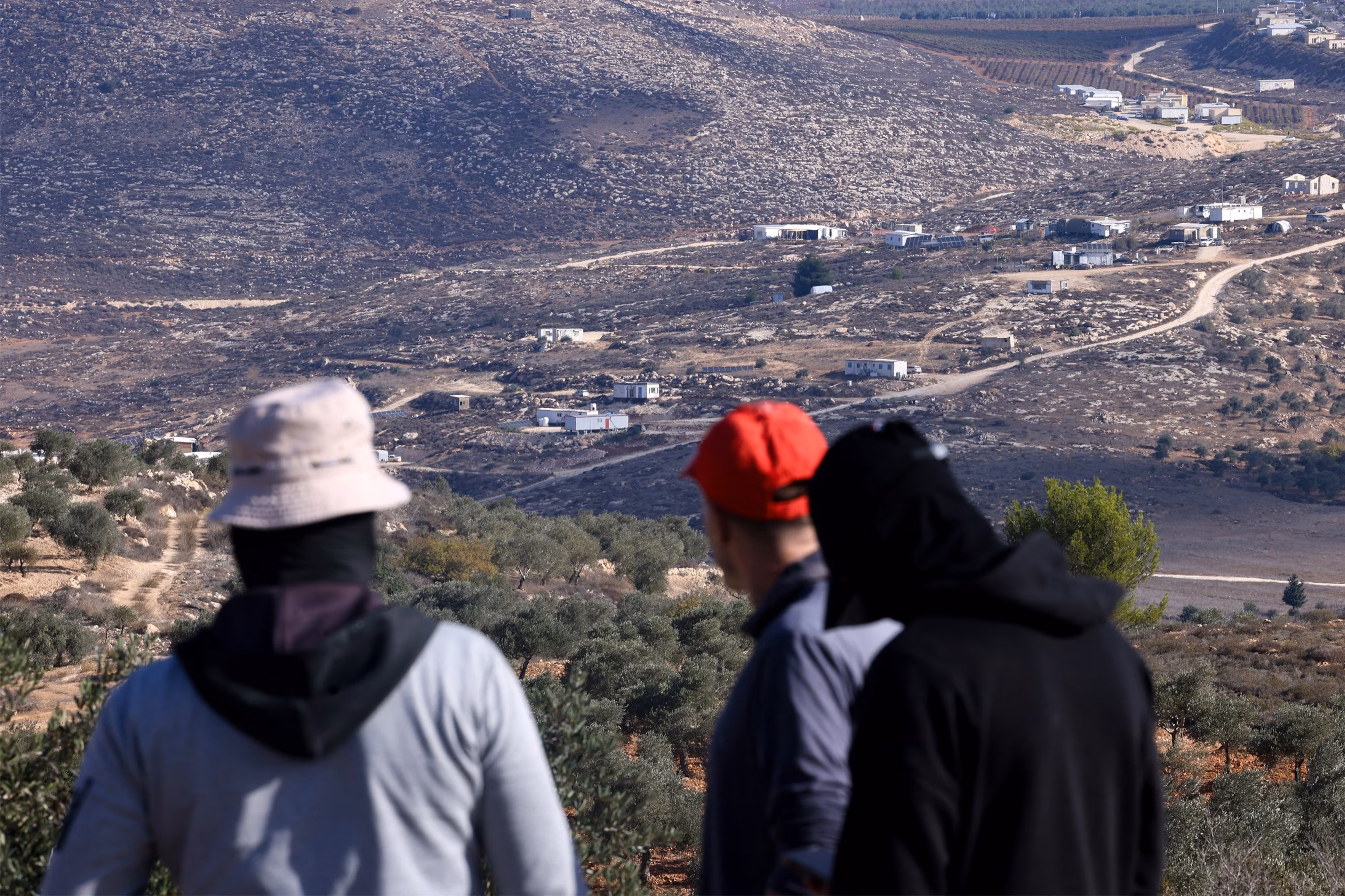 Люди дивляться на форпости ізраїльських поселенців поблизу села Турмос-Айя на Західному березі річки Йордан, 19 жовтня 2025 року. Хазем Бадер/AFP via Getty Images