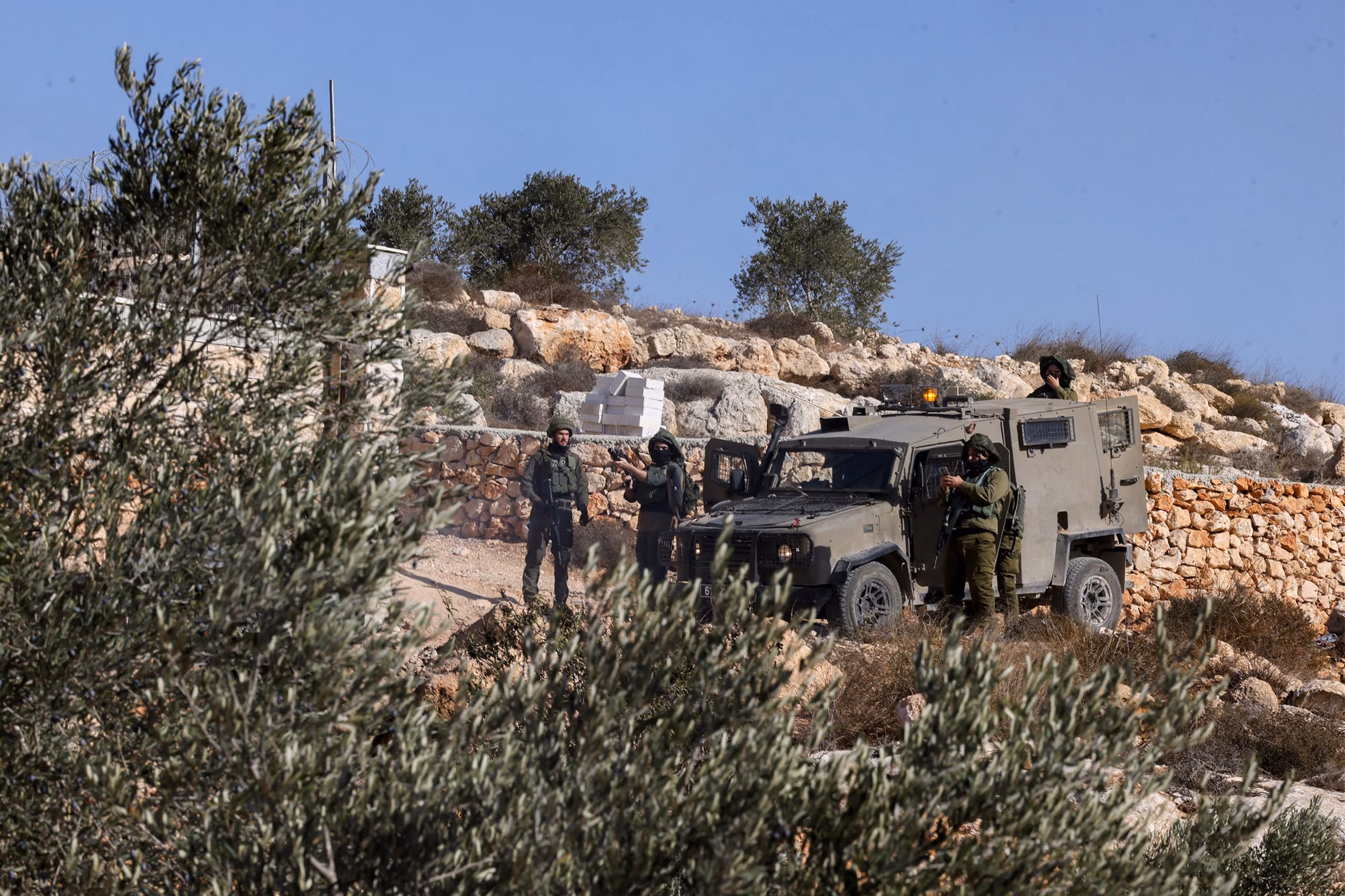 Ізраїльські солдати займають позиції біля автомобіля, який, як повідомляється, підпалили ізраїльські поселенці, намагаючись перешкодити їм збирати оливки поблизу села Турмос-Айя на Західному березі річки Йордан поблизу Рамалли 19 жовтня 2025 року. Хазем Бадер/AFP via Getty Images